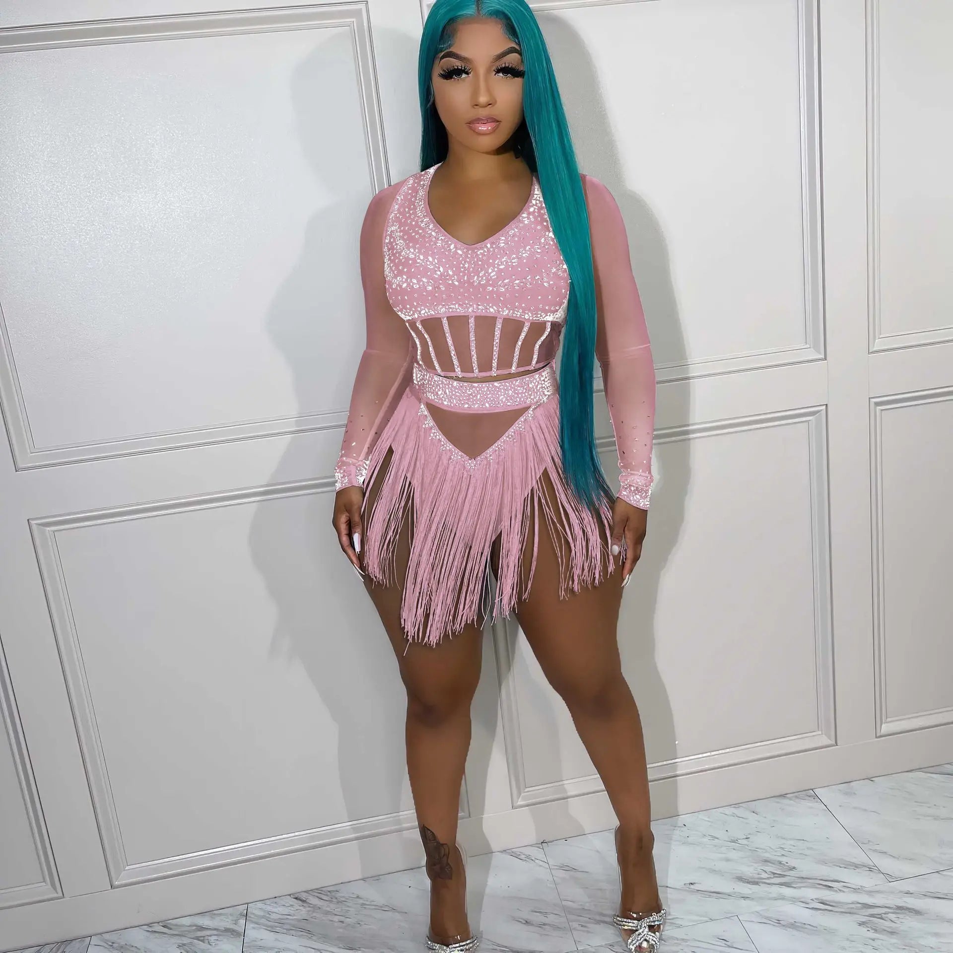 Mesh Rhinestone Club Outfits Sexy Women Two Pieces Crystal Tassel Party Matching Set