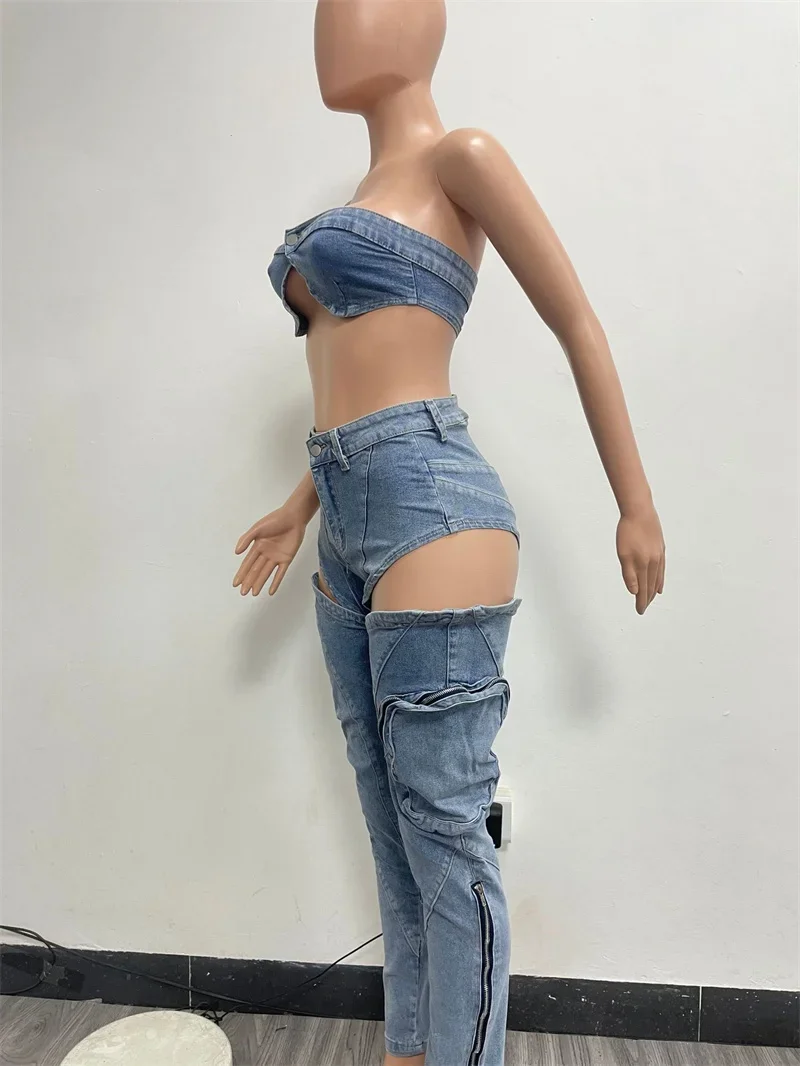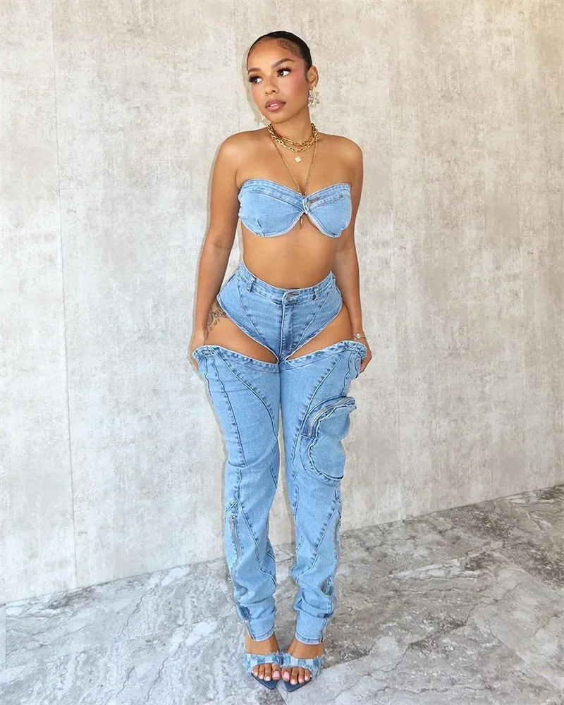 Nightclub Rave Party Crop Top + Cut Out Jean Pant Sets
