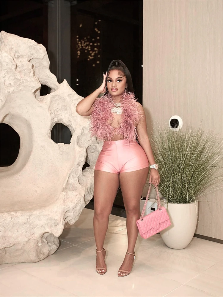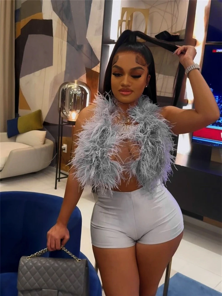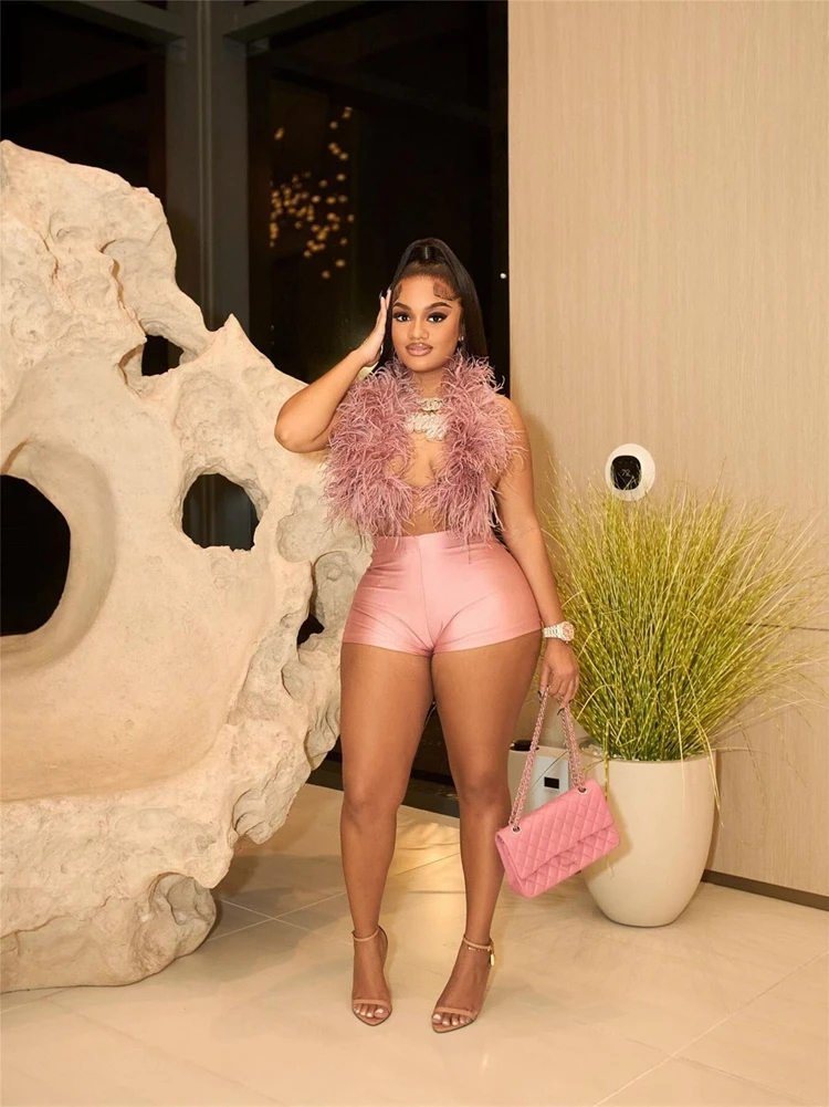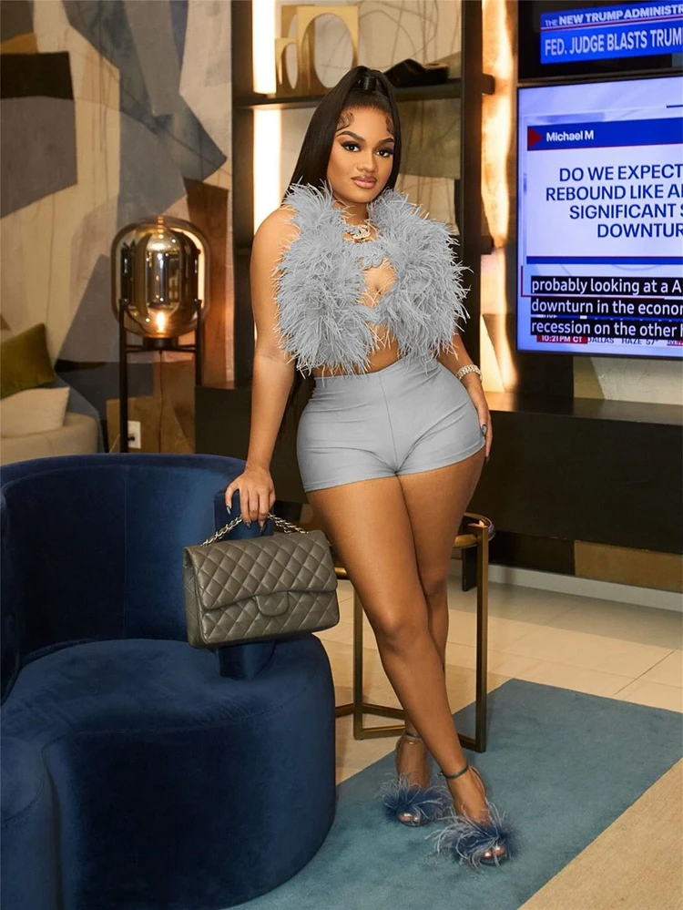 STYLISH LADY Fur Hollow Out 2 Piece Set Women Sleeveless Crop Top and Shorts Suits 2025 Summer Sexy Club Party Outfits