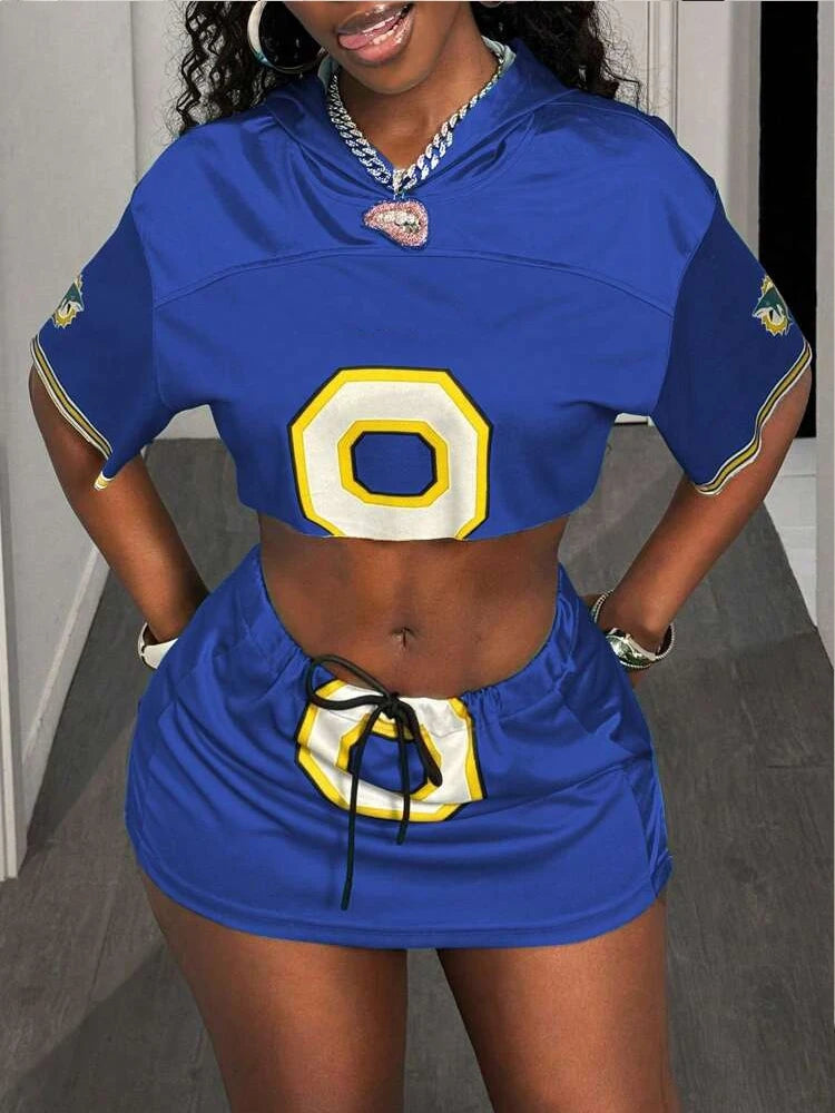 Hooded Short Sleeve Crop Tops+Side Split Skirts Matching Street Casual Sporty Outfits