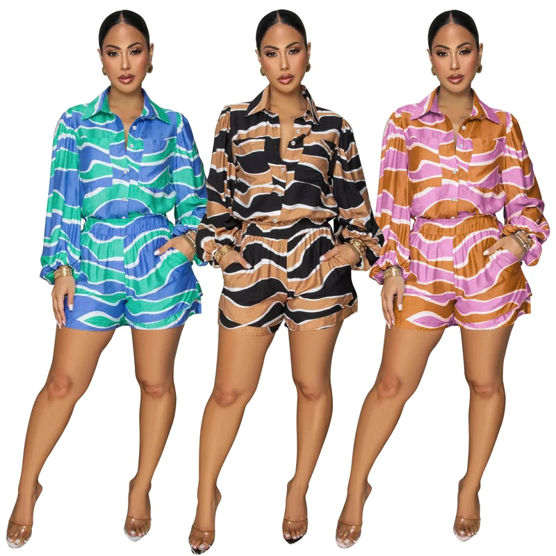 Collar Button Long Sleeve Shirt Top + Short Sets