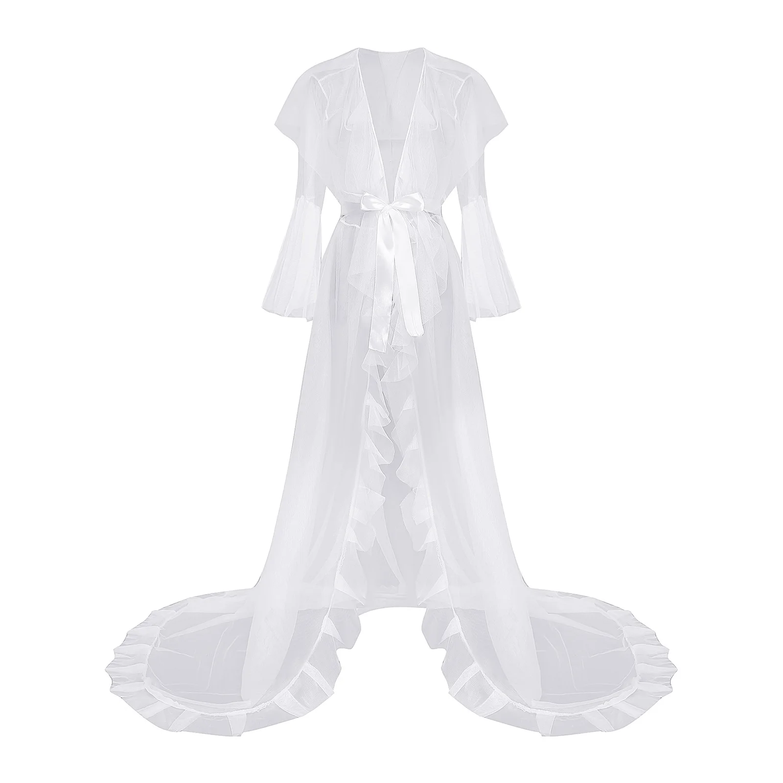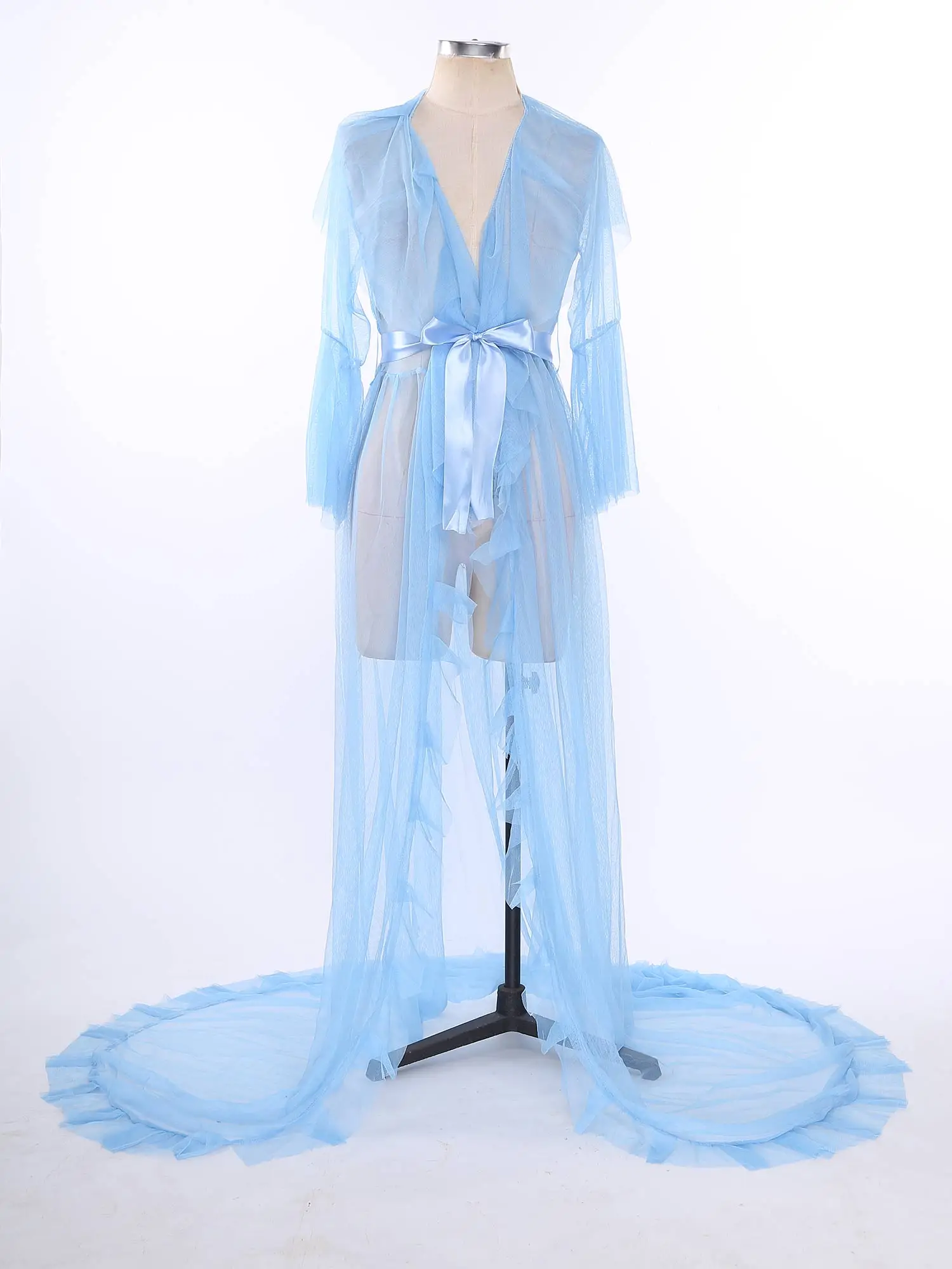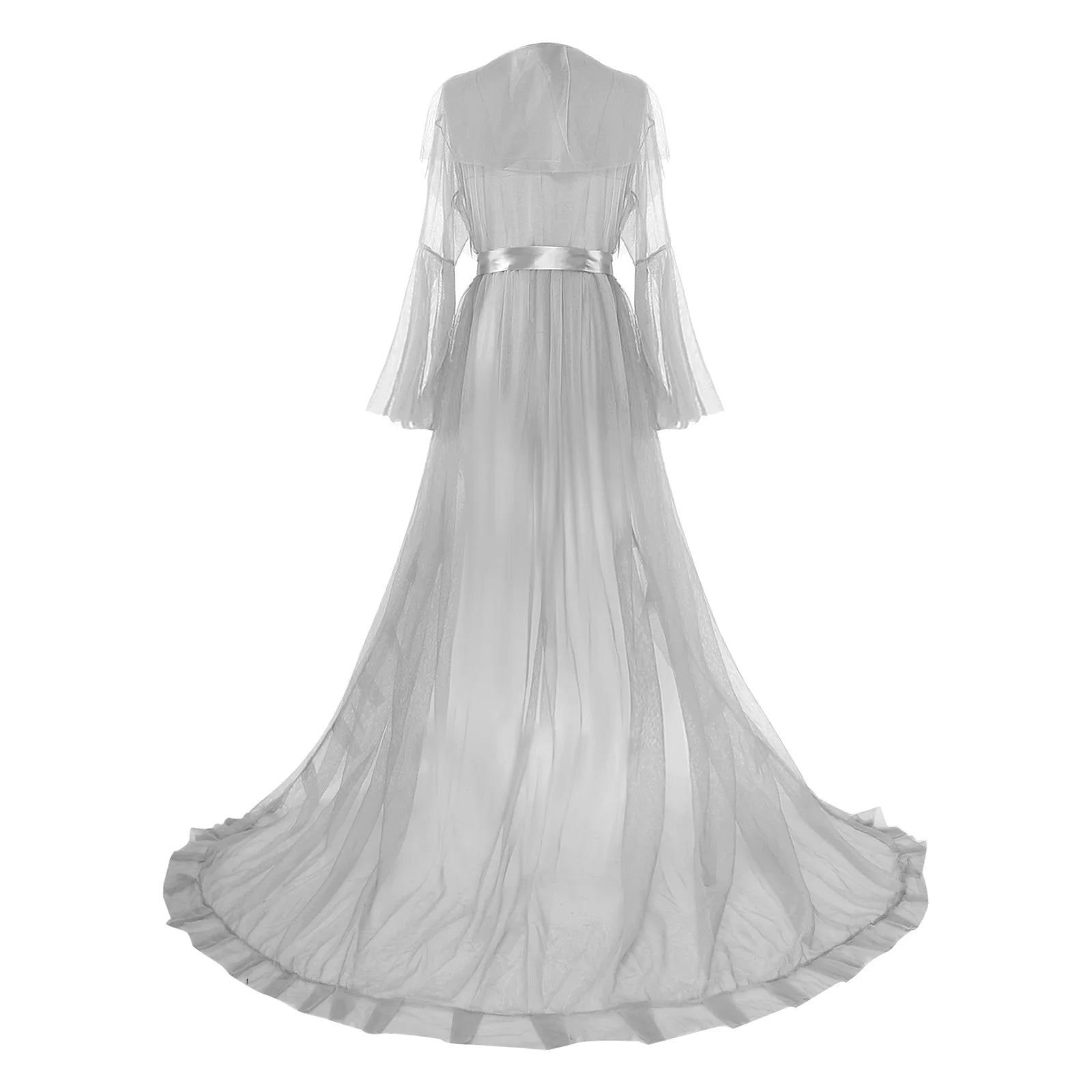 Ruffled Trim Long Tulle Robe Femme Nightwear Nightdress