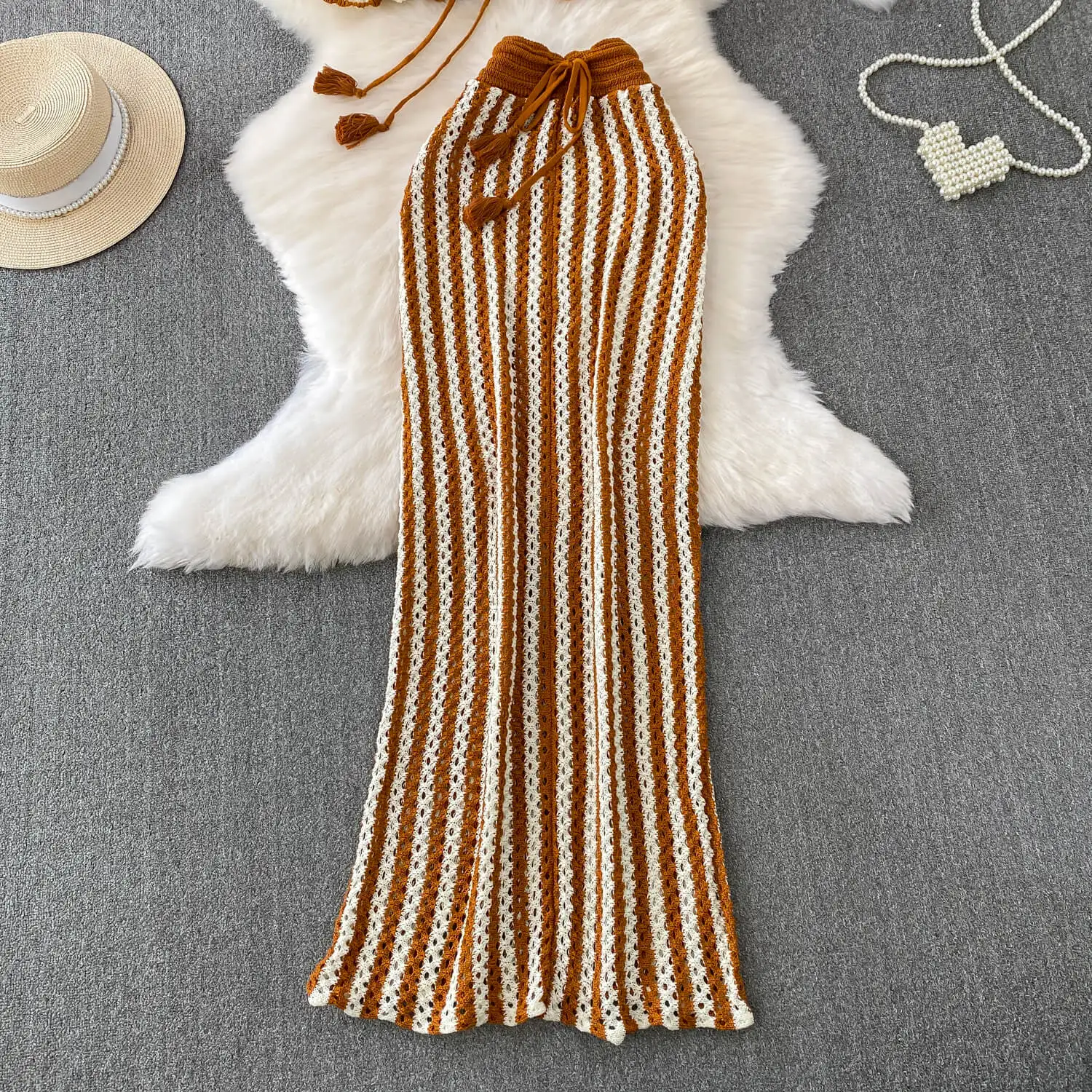 Vacation-style Lace-up V-neck Bell-sleeve Cropped Top and Knit Skirt |