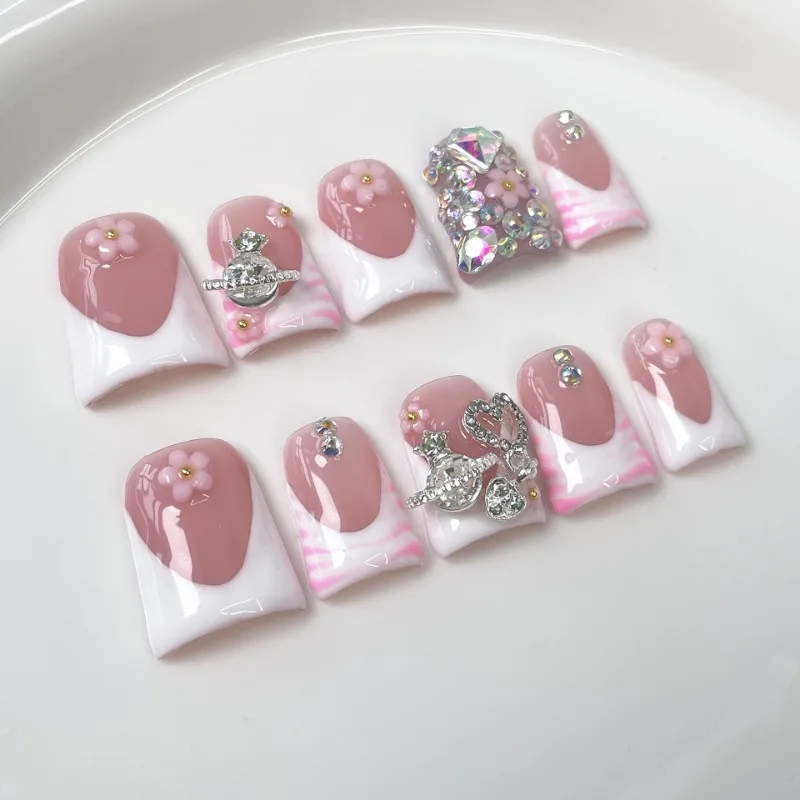 White French Nail Tips 10Pcs Short Duck Nails With Metal Rhinestones Decor Press On Small Flower Sweet Nude Acrylic Fake Nails
